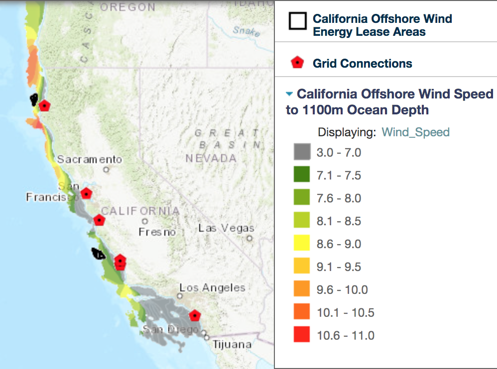 But looking at the offshore wind speed, it is immediately apparent that Southern California has low wind speed, which means that region is not really suitable for deploying offshore wind.