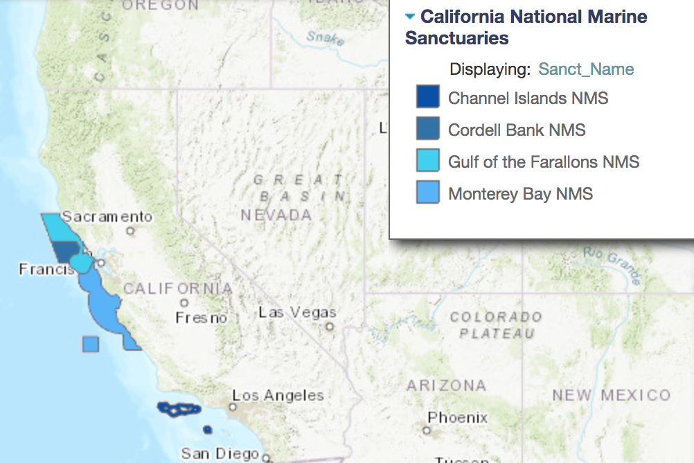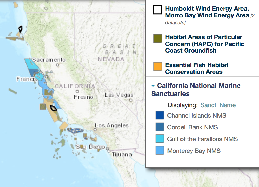 The following maps show California’s national marine sanctuaries and the biological habitat areas off California’s coastline. As you can see, the only area(s) that might not encroach the natural habitats would be the coasts off of rural Northern California, a part of Central Coast, and Southern California.