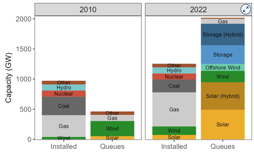 Per the LBNL study (2023), as of the end of 2022, the total capacity active in the queues is growing year-over-year, with >2,000 GW of generation and storage capacity. About half of that are from solar and solar (hybrid). About 150 GW of offshore wind is in active queue capacity.