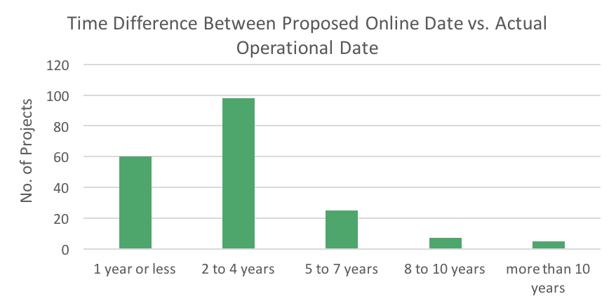 Needless to say, California’s long process means projects that do come online come at later dates than anticipated. These delays often translate to additional project costs. In fact, almost 1/5 of these projects faced a delay of 5 or more years.