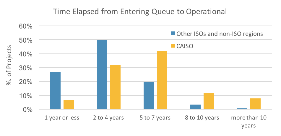 Make no mistake, permitting bottleneck is a pervasive problem plaguing energy projects nationwide. But the problem seems more acute in California. Outside of CAISO, 3/4 of the projects in the dataset took fewer than 5 years from entering the queue to becoming operational. But just 38% of the projects in CAISO jurisdiction took fewer than 5 years to become operational. On the other hand, 1/5 of the projects in CAISO took at least 8 years to come online compared to just 4% of the projects in other regions.