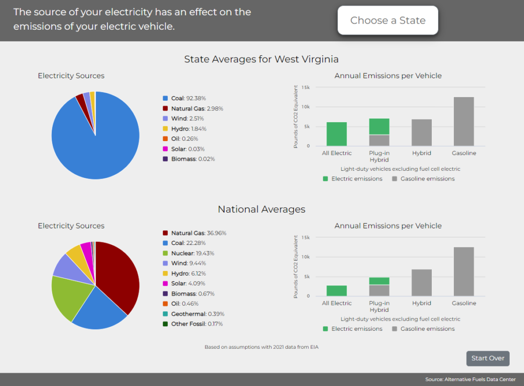 Indeed, the Department of Energy’s Alternative Fuels Data Center has a calculator that compares annual emissions by powertrain. Even in the most coal-heavy states like West Virginia and Wyoming, EVs (and plug-in hybrids) both have substantially lower emissions than ICEVs per annum.