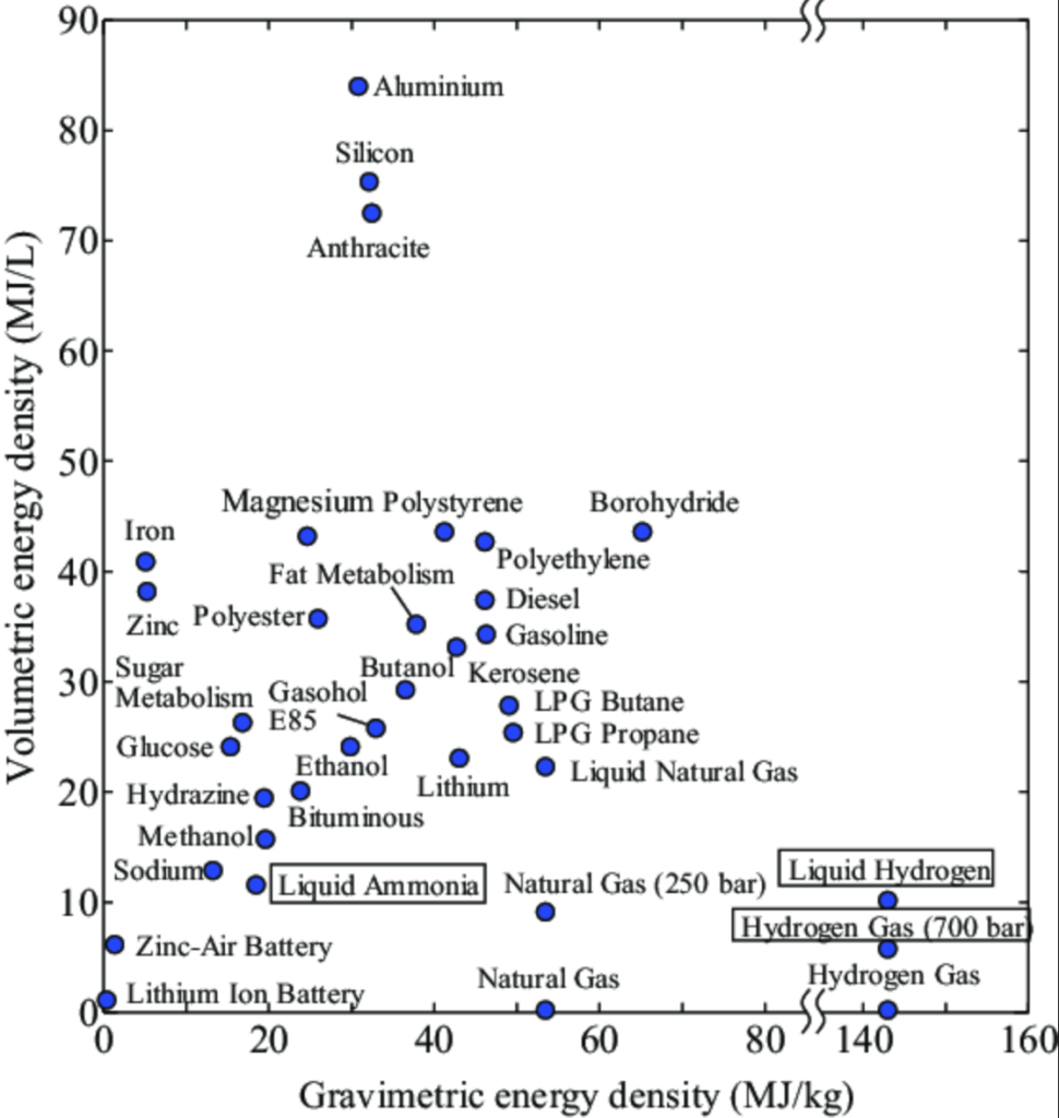 Compared to other candidate clean fuels and fossil fuels, liquid ammonia sits somewhere in the middle of the pack in terms of gravimetric and volumetric densities. It has both lower gravimetric and volumetric densities than gasoline and diesel as well as E85 gasohol. However, it trumps lithium-ion batteries in both and comfortably beats gaseous hydrogen (both 350 bar and 700 bar) in volumetric density. Furthermore, ammonia is liquid at ambient temperature, making it easier to store and transport than hydrogen.
