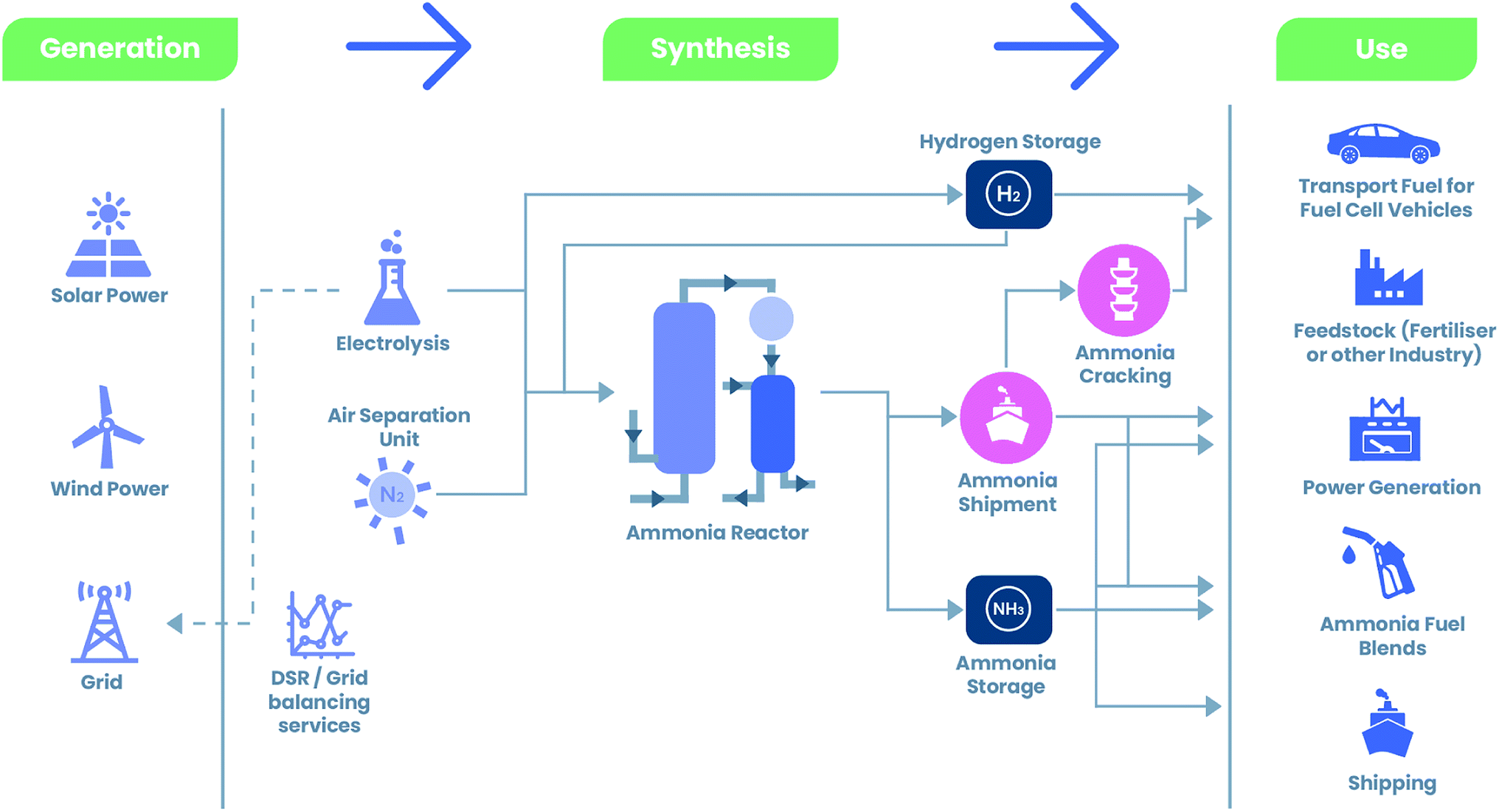Ammonia (NH3) is produced by combining gaseous hydrogen with nitrogen from the air. Large-scale ammonia production uses natural gas for the source of hydrogen (grey hydrogen). However, if the market for clean hydrogen takes off, ammonia can be produced cleanly as well.